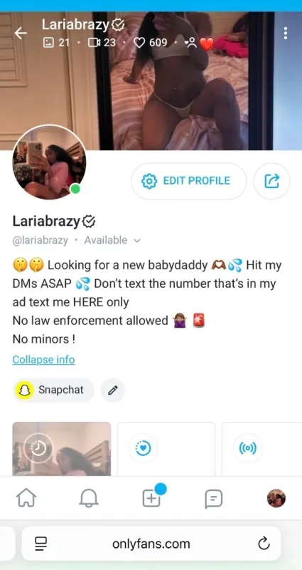 I'm currently looking for a new babydaddy π€«π€«π€«π€«π€« My last 2 baby daddies are literally no where to be found but its fine π I been having this secret fetish for a long time ,Dont miss me this time , this is my 3rd time finding a random person to be my baby daddy ! Everybody be wondering who my last 2 are but Shit idk who they are my damn self π¦ I have a serious fetish of getting nutted inside of by random men and raising their babies no strings attatched π©π©π₯Ίπ₯Ίπ₯Ίπ₯Ί ( P.s HIT ME UP ON ONLYFANS ONLY π I DON'T RESPOND TO PEOPLE TEXTING MY PHONE NUMBER π¨ THE POLICE ARE ACTIVE ON IMESSAGE ETC , IF U DON'T HAVE ONLYFANS THEN MAKE ONE DADDY AND HMU π NO LAW ENFORCEMENT ! π¨ HMU DISCREETLY ON ONLYFANS π€€π€€ (Texting about A meet up on my meesages is a FEDERAL crime, and I dont commit crimes I just wanna fuck the people on my onlyfans LEGALLY with somebody with the same fetish as me π€«π€€ ) At the time of me writing this its FREE , but that may change soon ! Add me daddy ππ€€ I be horny as fuck like all of the time and I'm ready to have another baby , my last 2 babies are 4 years old and a 1 year old its been long enough I need to get nutted inside of again π©π© I dont care if your dick is small or large I just want cum inside of me simple ! I'm a freaky ass bitch and prolly the sexiest freak u gonna find i'm all yours Dada π€«π«π« AFTER I get pregnant we can keep fucking for free if u want I'll always wanna fuck my babydaddy's π«£π I love when that warm cum is inside of my wet pussy it feels so good like omg π₯Ίπ₯Ίπ₯Ί If u interested hit me up daddy ππ I'm SUPER fertile and im looking for a freak thats just like me ππ I been escorting for 6 years and So far I have 2 baby daddies I only met them once , I'm so fertile rn I been wet n horny asf like every day lately π©π¦ My pussy tight as fuck and My head 10/10 but don't nut inside of my mouth do it in my pussy no condoms no birth control ππππ€€ If u wanna talk to me DO NOT text my phone number I won't respond π daddy π Text me on Onlyfans ONLY if u interested in getting me pregnant π€«π€«π€€ My onlyfans name is @ Lariabrazy Text me on onlyfans ONLY daddy, I respond FAST ASF on there ! I don't respond to people texting my phone number, I use that for my personal life β€οΈβ€οΈπ«Ά Serious freaks ONLY NO MINORS ! Cum in me π¦ Get me pregnant π€°π½ And leave βπΎor stay π«Άπ½π«Άπ½β€π©·π©΅ ( preferably I want you to stay π₯°) @Lariabrazy hit me up on OF Dada π€€π€€ If you dont have one make one ASAP π€€π€«π€« Also, I'm disease free currently π¦π¦π¦ and i'm Fertile asf right now π€«π€«π€«π¦ I'm petite and taste like Candy πππ