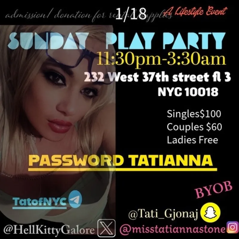 Come out tonight for a night of pure bliss ! located in a upscale loft in the heart of miidtown ! This is a group /open play event only door fee no other fee Its a lifestyle /swinger type party for all single men /single women and cpuples 🌸🌸🌸🌸🌸🌸🌸🌸🌸🌸🌸🌸🌸🌸🌸🌸 1-18 WinterfestFriday Special Admission No need to text just come address below Singles Tonight 100 Ladies Free Couples Tonight 60 BYOB if like Cone watch play and enjoy !! ⬇⬇⬇⬇⬇⬇⬇⬇⬇⬇⬇⬇⬇⬇⬇ 11:30 to 3:30 am 232 West 37th street Floor 3 NYC NY 10018 password Tatianna for this admission see you there ⬆⬆⬆⬆⬆⬆⬆⬆⬆⬆⬆⬆⬆⬆⬆⬆⬆ 🍑🍑🍑🍑🍑🍑🍑🍑🍑🍑🍑🍑🍑🍑🍑🍑 This is a open-minded anything goes event !! Come Kinky and readt for NYC hottest Freak OFF party 🦄🦄🦄🦄🦄🦄🦄🦄🦄🦄🦄🦄🦄🦄🦄 only door admission no other fee ‼ BYOB Watch ,Play and 💦💦💦💦💦 lots girls couples Singles guys welcome !!! goigle me Tatianna Stone /Now Tatianna Gjonaj